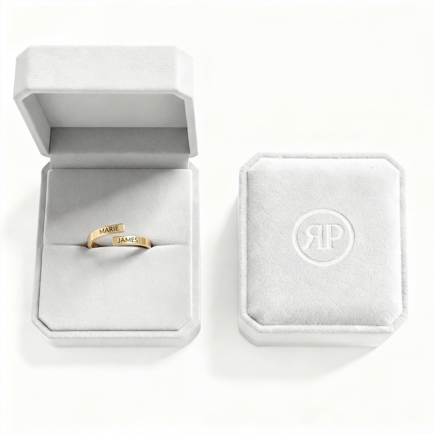 Een verfijnde open ring met aan elk uiteinde een initiaalmotief, die de band tussen twee zielen symboliseert. Het strakke, moderne ontwerp maakt het perfect voor dagelijkse elegantie.