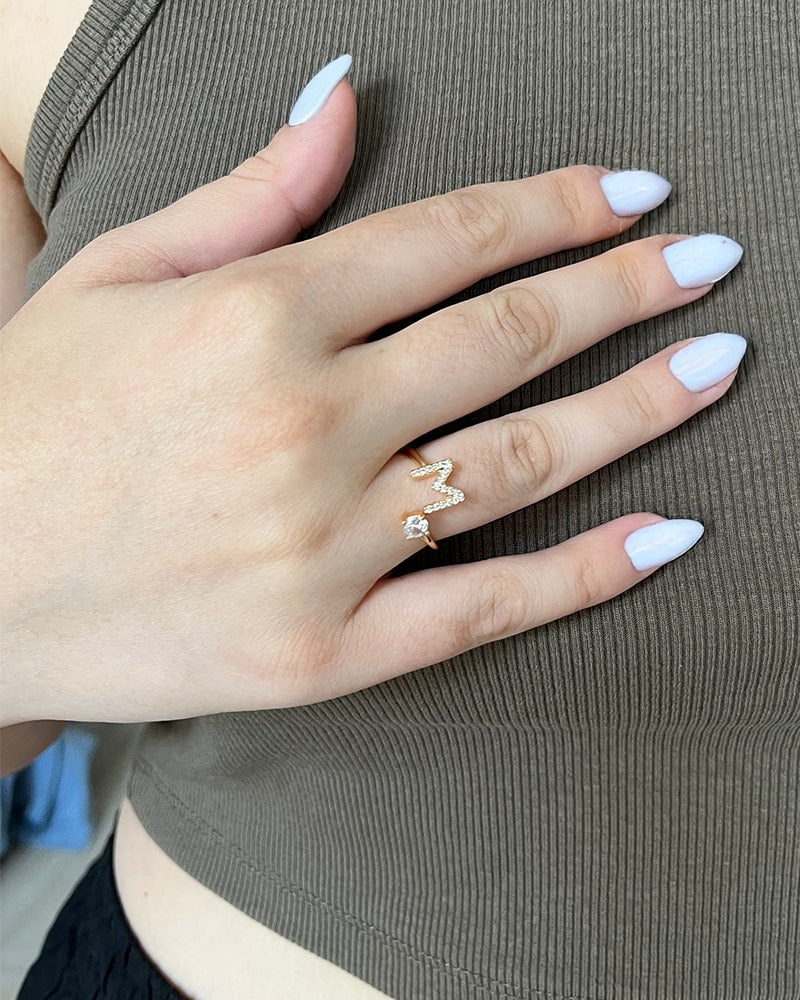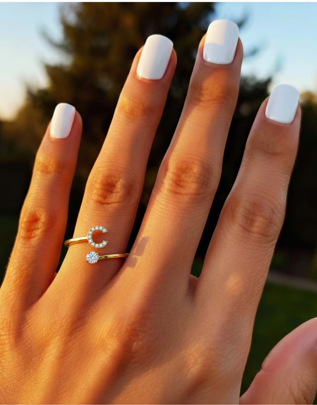 Delicaat maar duurzaam, deze ring heeft een slanke, gepolijste band en een fonkelende initiaal die het licht moeiteloos vangt. Gemaakt van roestvrij staal en zirconium, is hij hypoallergeen, water- en oxidatiebestendig en zal hij je huid niet verkleuren. Comfortabel genoeg voor dagelijks gebruik, betekenisvol genoeg voor een leven lang.