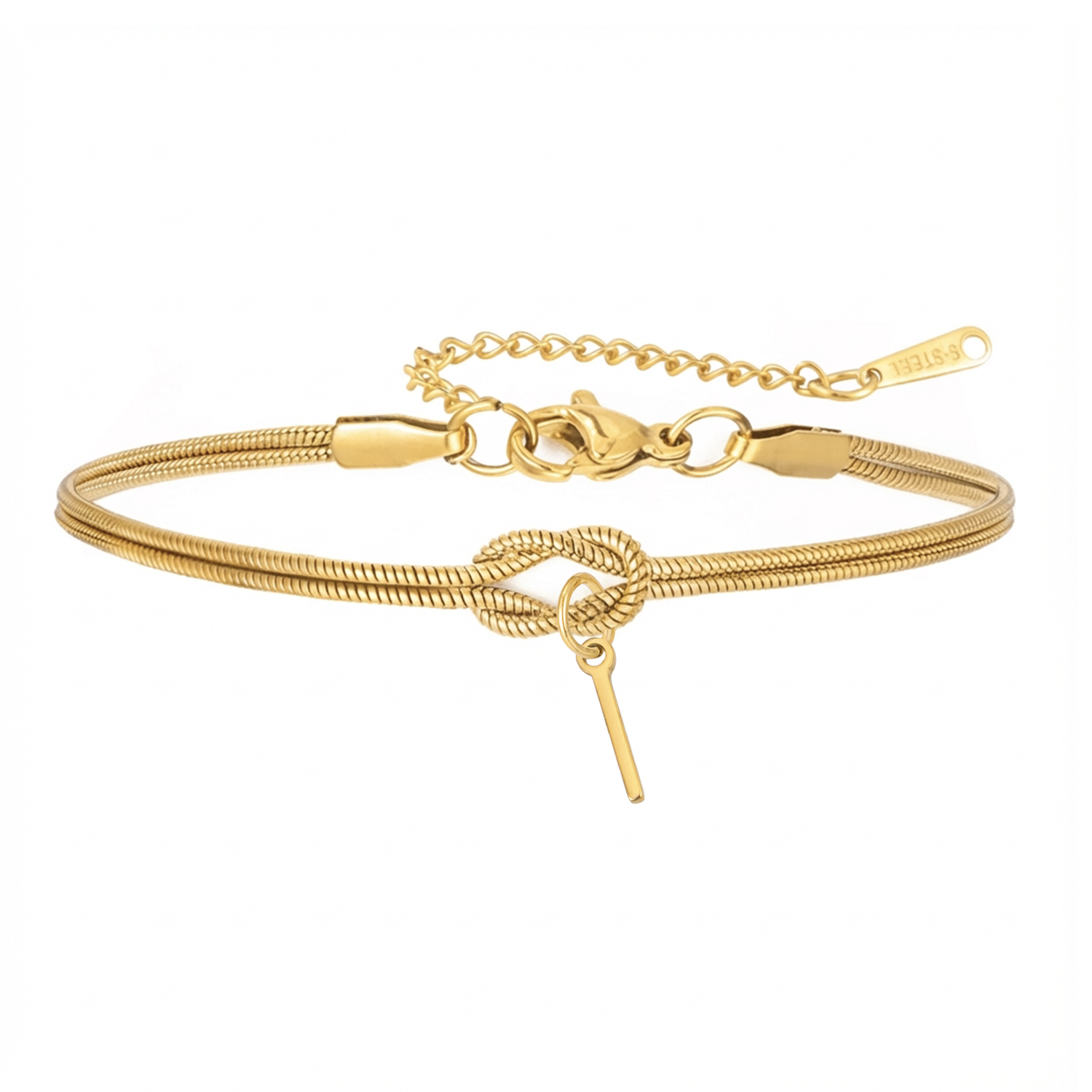 Een schakel die je elke dag kiest om te dragen. Deze slanke, eigentijdse armband combineert een elegante slangenketting met een symbolische knoop, waaraan een gepersonaliseerde initiaal hangt om een sterke verbondenheid te belichamen. Een subtiel detail dat veel zegt: of het nu je eigen letter is of die van een dierbare, het blijft kostbaar en dicht bij je.