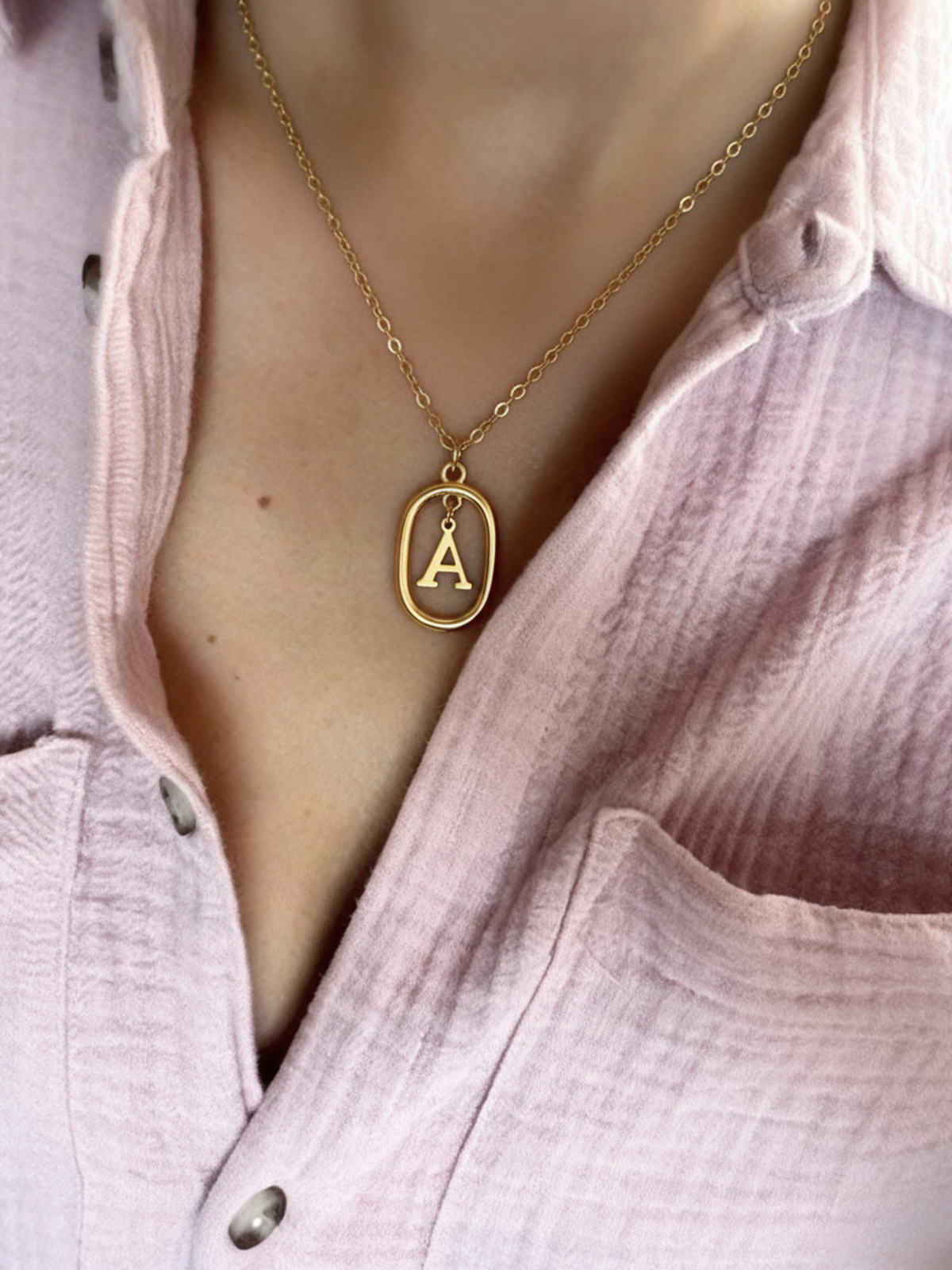 Druk je uniekheid uit met deze gouden initialenhalsketting, met een minimalistisch en verfijnd ontwerp. Een letter die in het midden van een gladde ovaal hangt, voor een stijl die zowel modern als persoonlijk is.