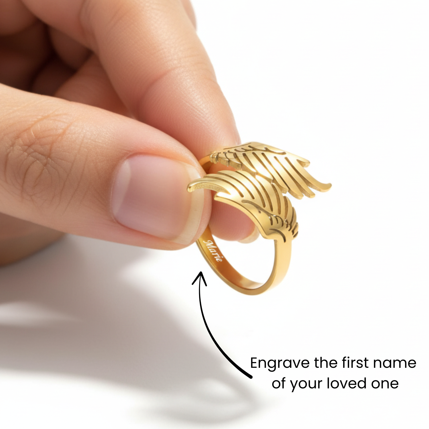 Met het elegante ontwerp van engelenvleugels is deze aanpasbare ring meer dan alleen een sieraad, het symboliseert een eeuwige band. Tijdloos en verstelbaar, het past perfect bij elke gelegenheid, of je nu een kostbare herinnering eert of blijvende liefde uitdrukt.