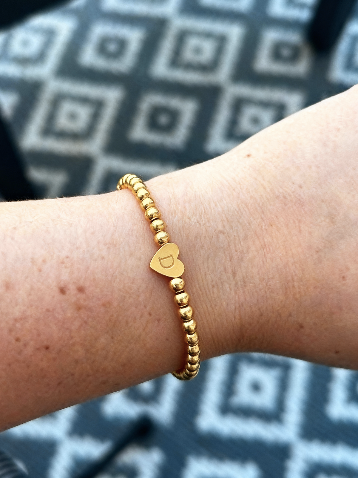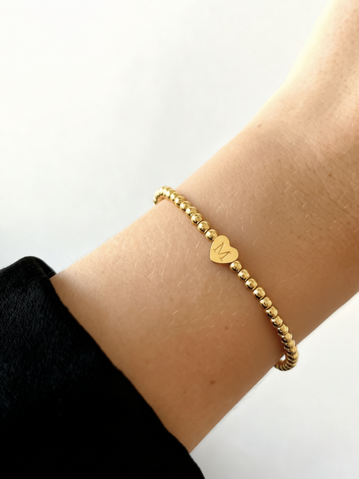 Deze verfijnde armband, gemaakt van goud- of zilverkleurige kralen, wordt verfraaid door een klein centraal hartje gegraveerd met de initiaal van jouw keuze. Symboliseert liefde, familie of vriendschap, en past om alle polsen dankzij het comfortabele stretchontwerp. Of het nu als cadeau is of een verwennerij voor jezelf, dit minimalistische en chique stuk belichaamt een unieke verbinding.