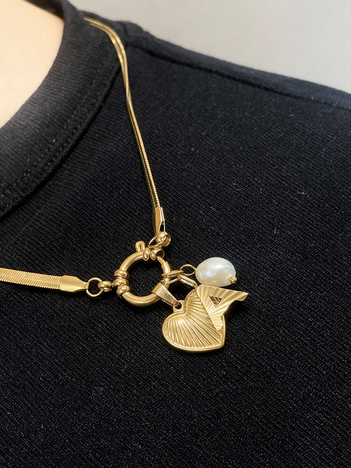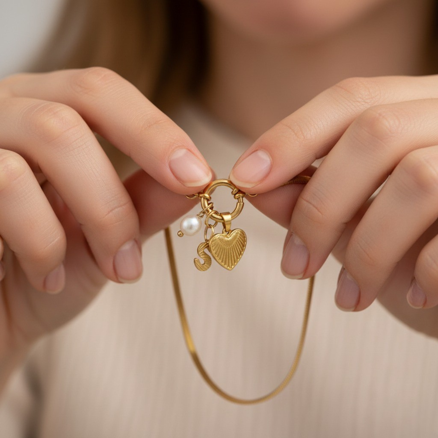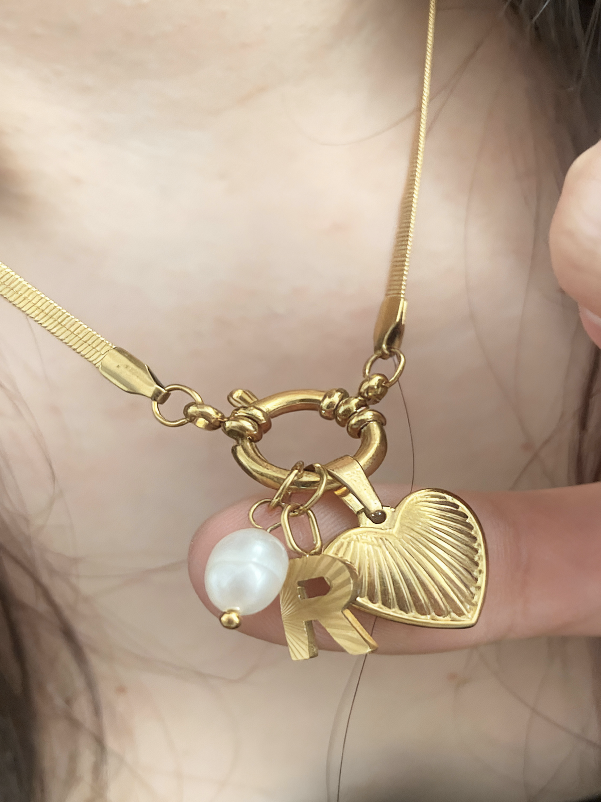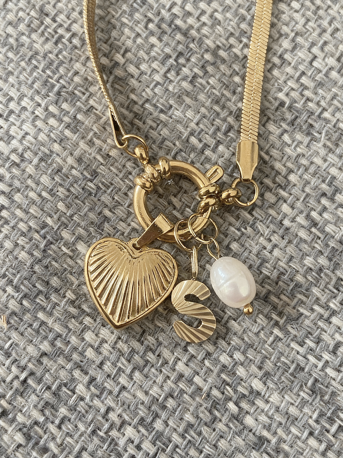 Eén ketting, drie symbolen. Dit unieke stuk brengt een gepersonaliseerde letter, een fijn getextureerd hart en een natuurlijke witte parel samen om een intieme en elegante boodschap te creëren. Elke bedel vertelt een verhaal : een betekenisvolle initiaal, liefde in al haar vormen, en de tijdloze zachtheid van een parel.