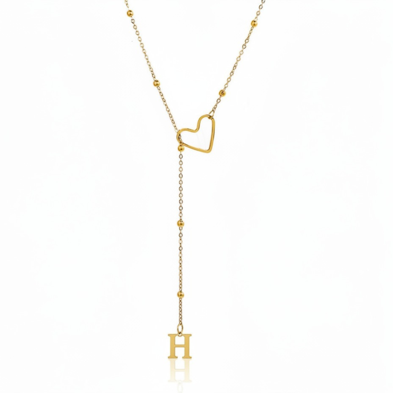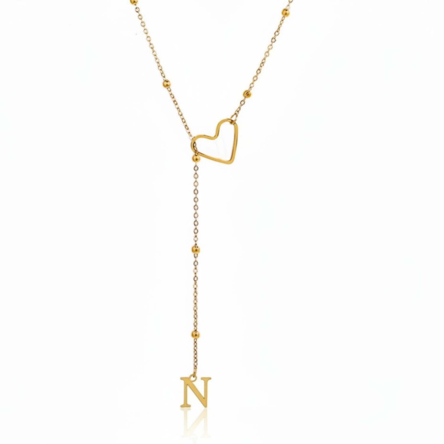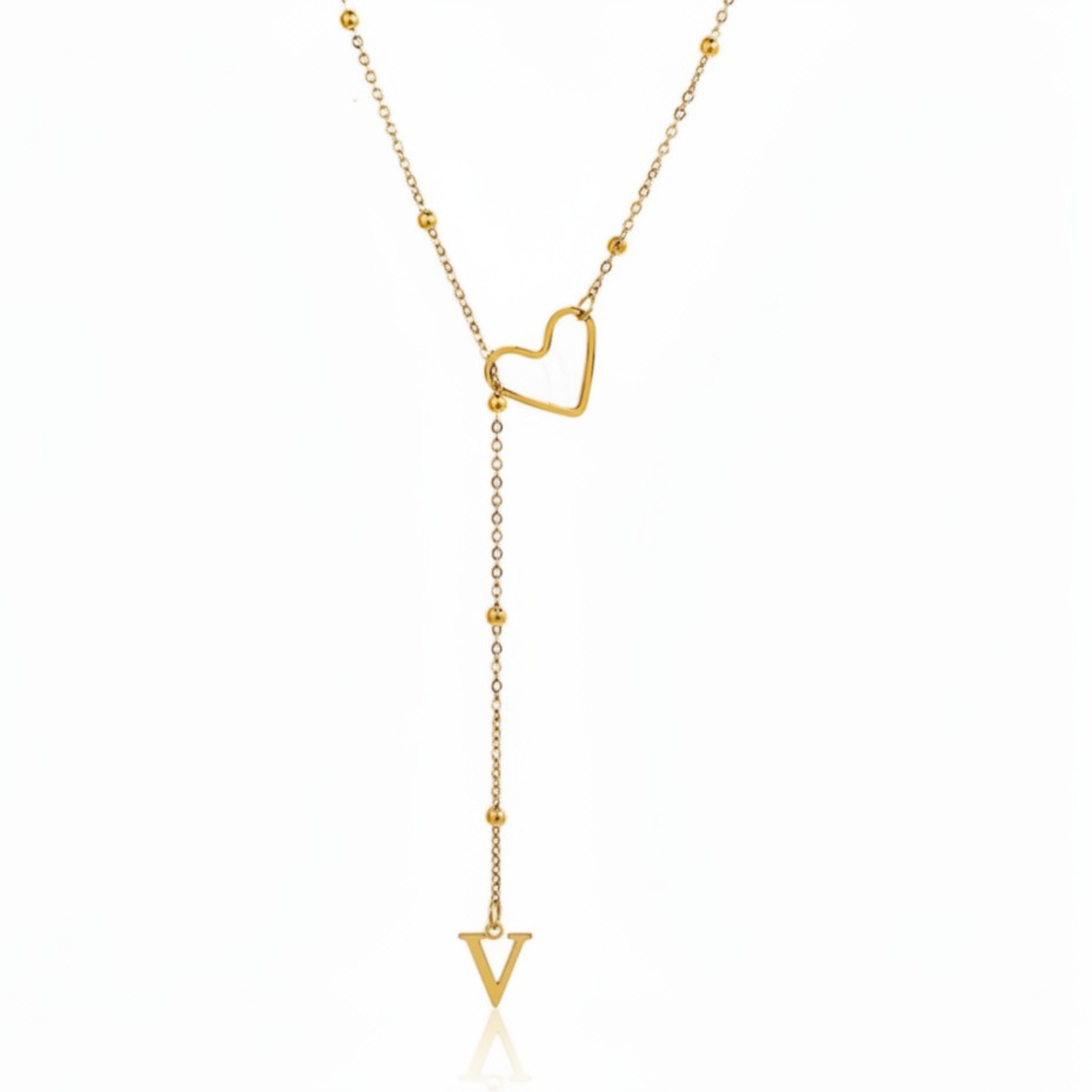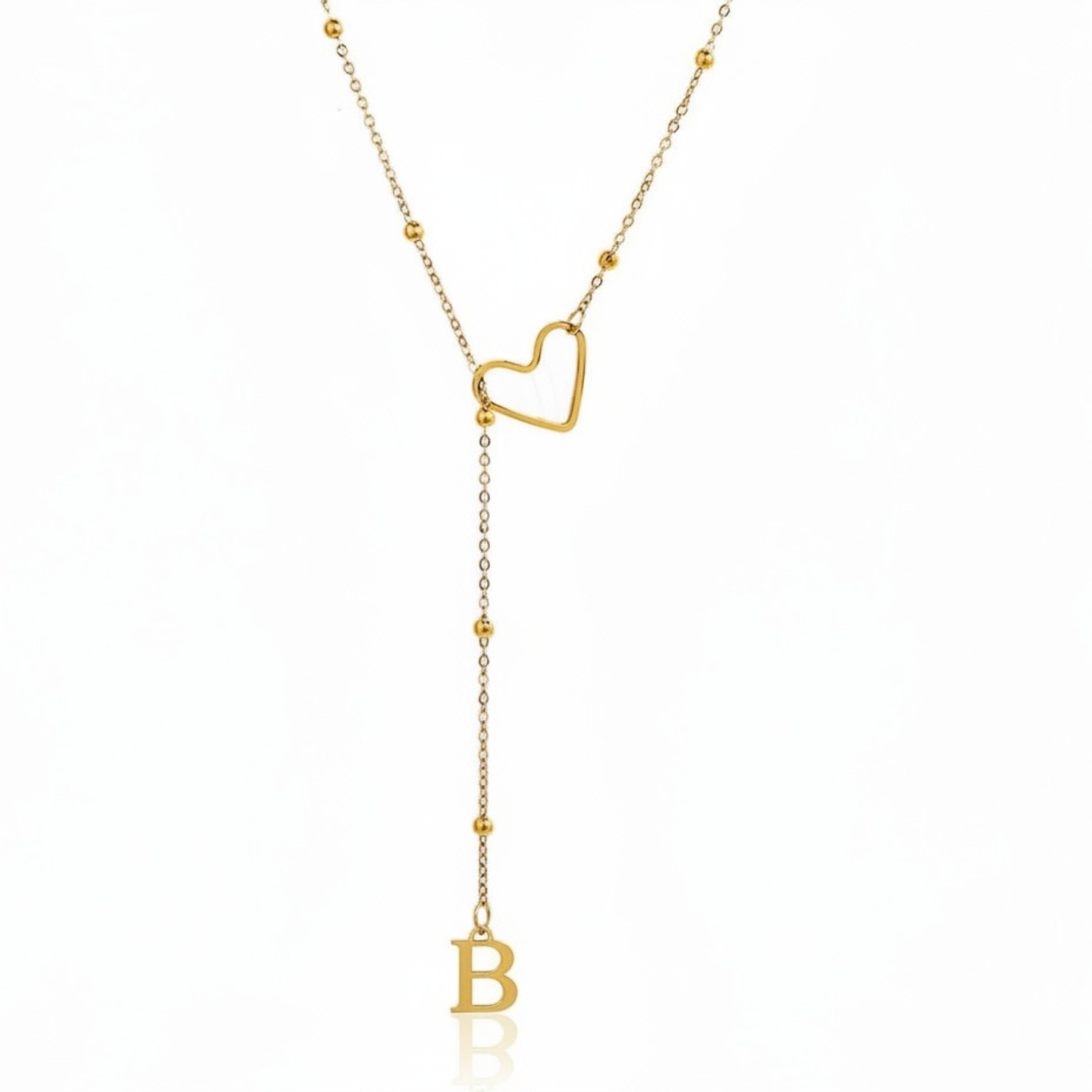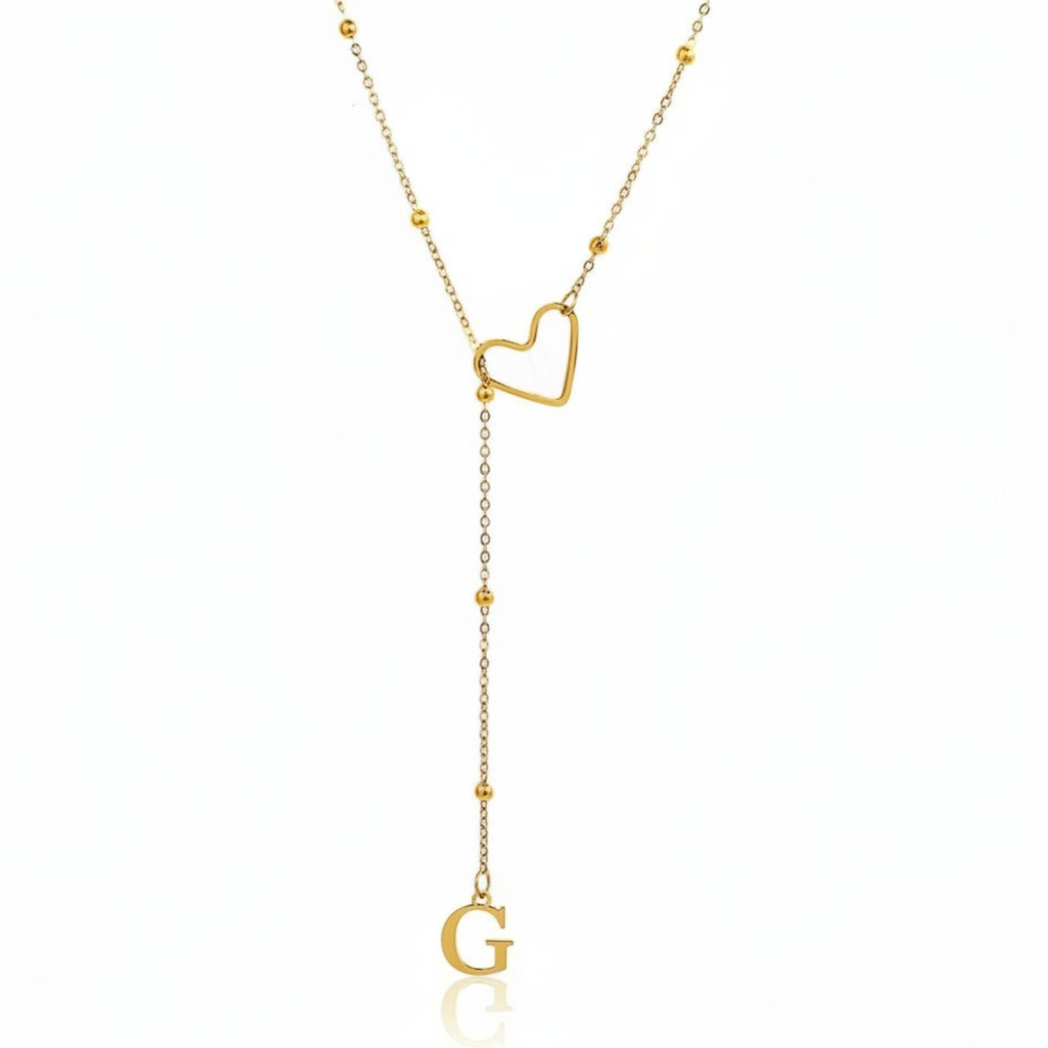 Deze verfijnde ketting vangt de essentie van persoonlijke verbinding: een delicaat hangende letter die zachtjes door een gouden hartje gaat, wat diepe en intieme verbondenheid symboliseert.