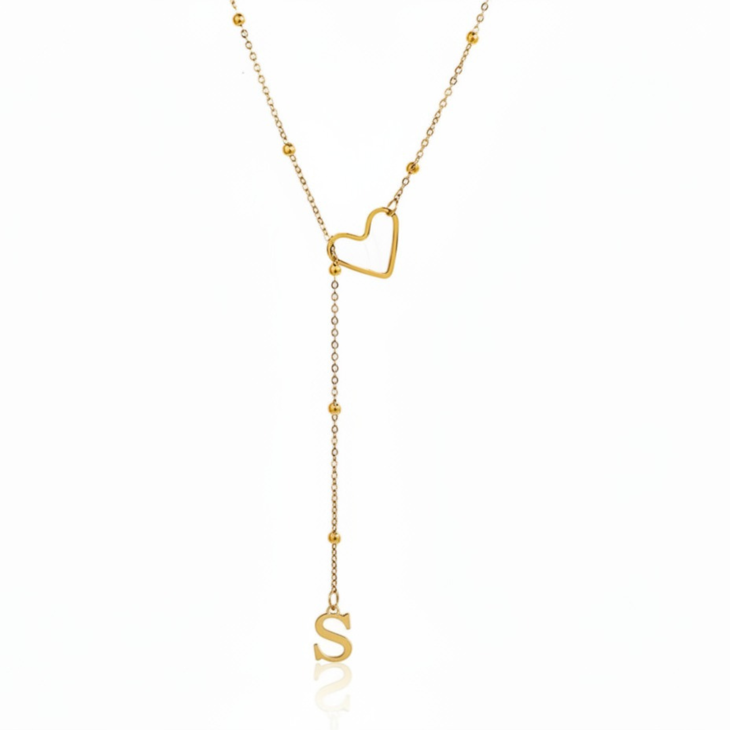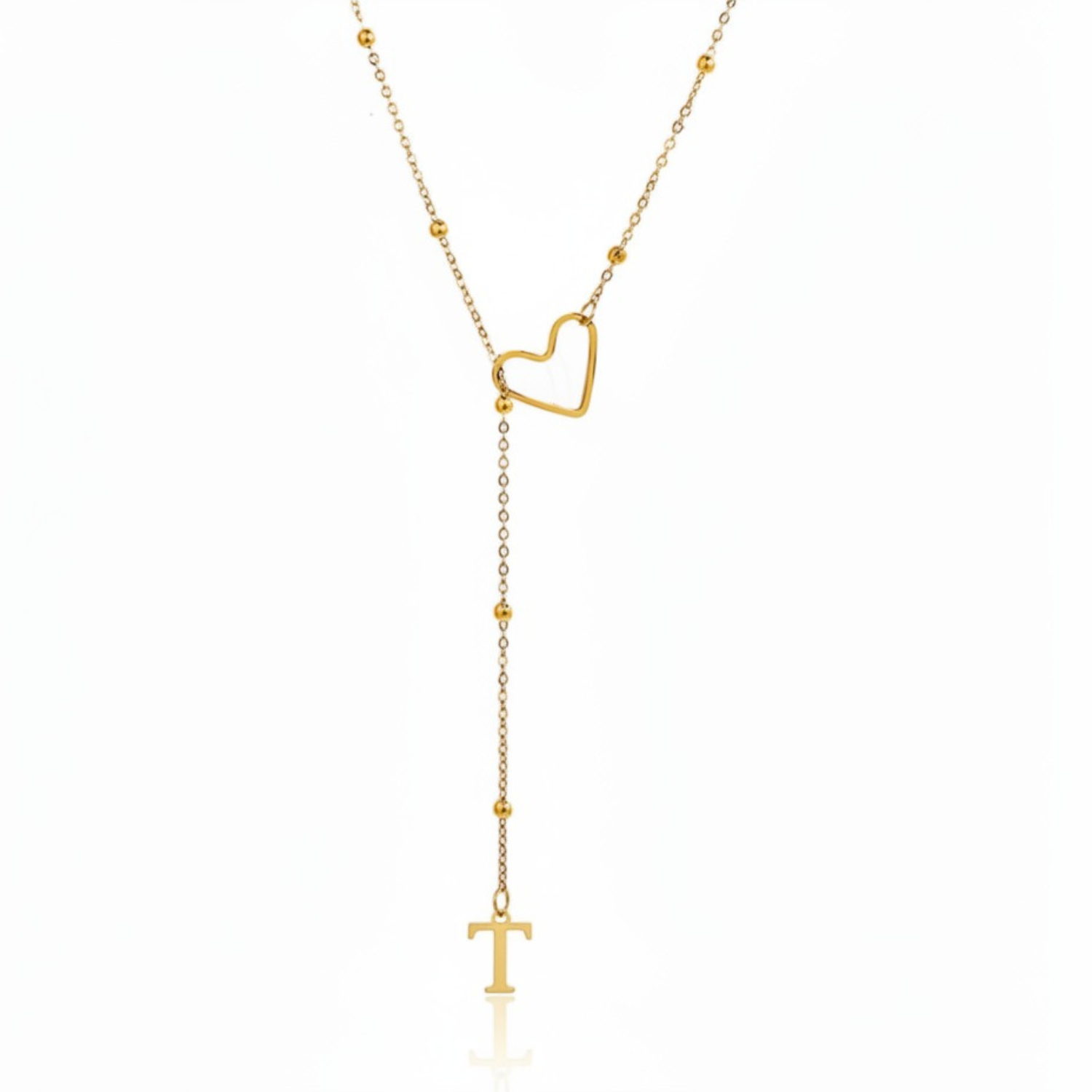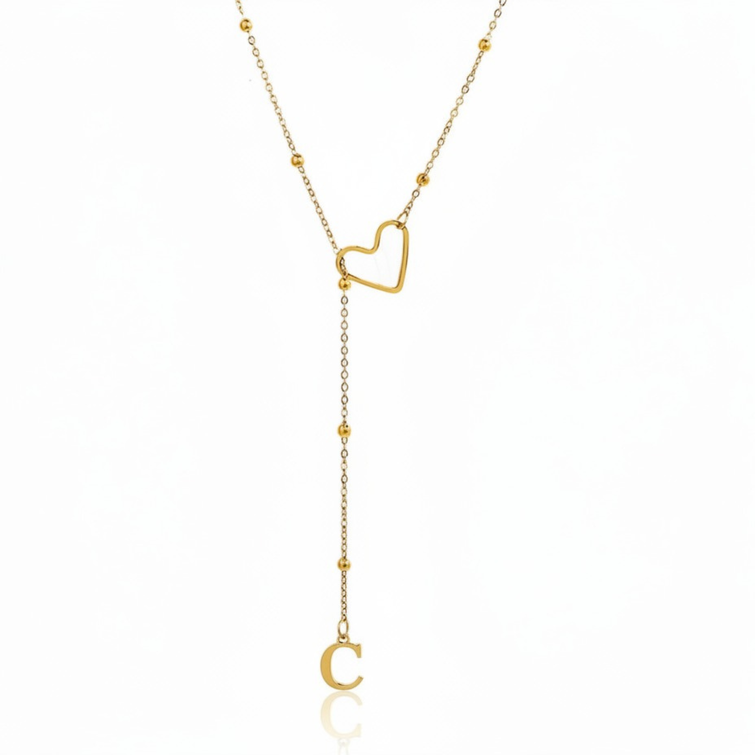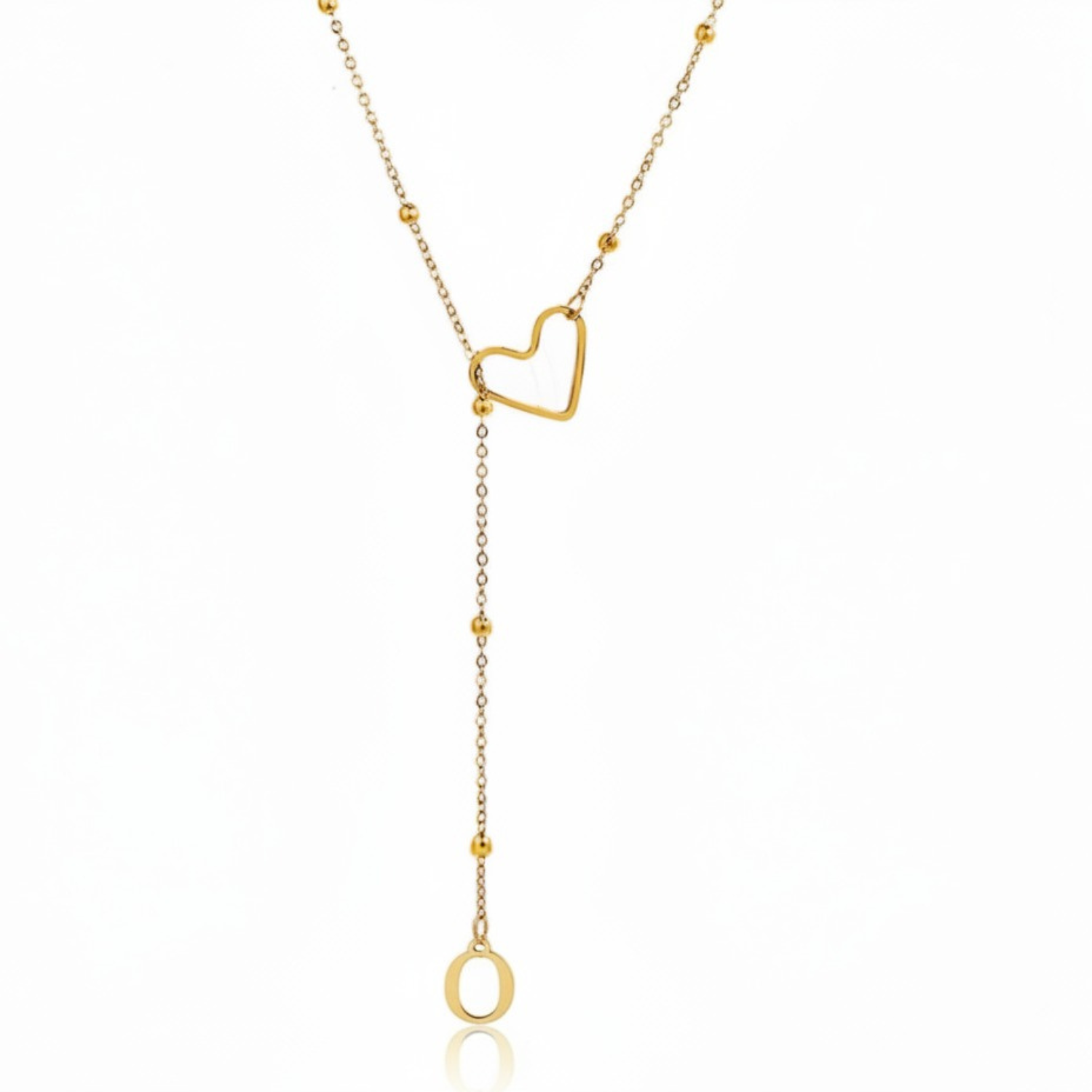 Deze verfijnde ketting vangt de essentie van persoonlijke verbinding: een delicaat hangende letter die zachtjes door een gouden hartje gaat, wat diepe en intieme verbondenheid symboliseert.