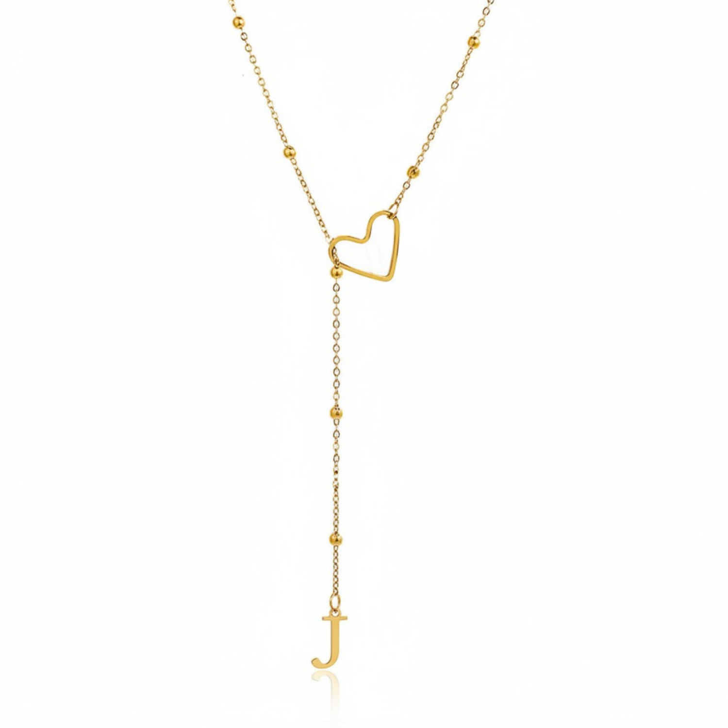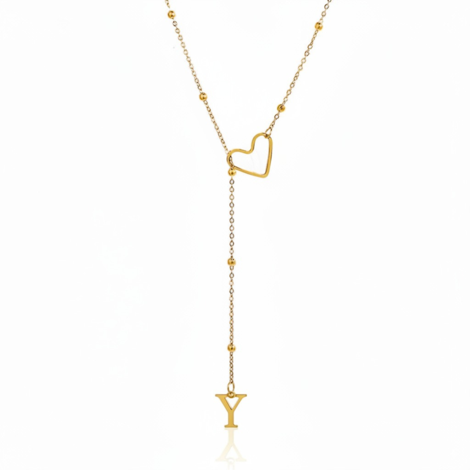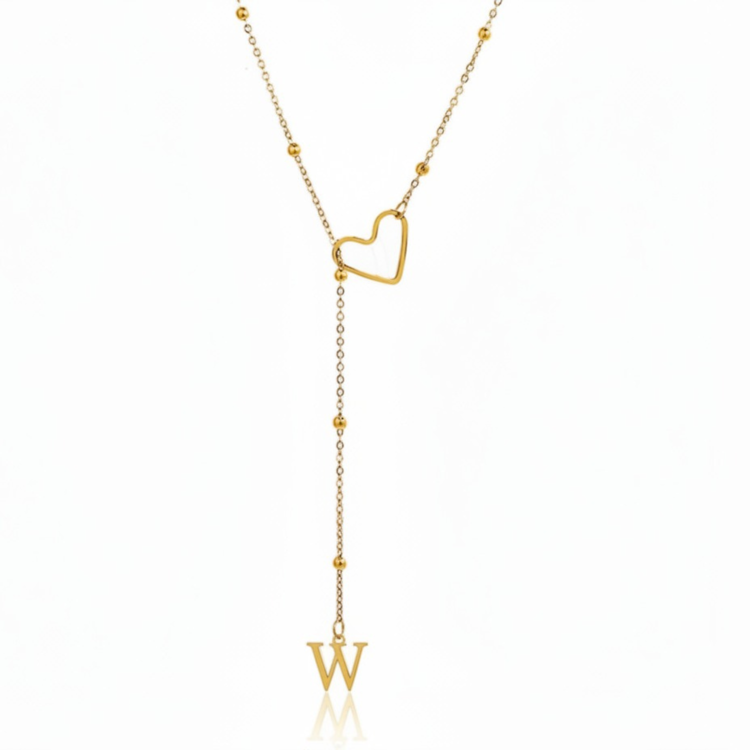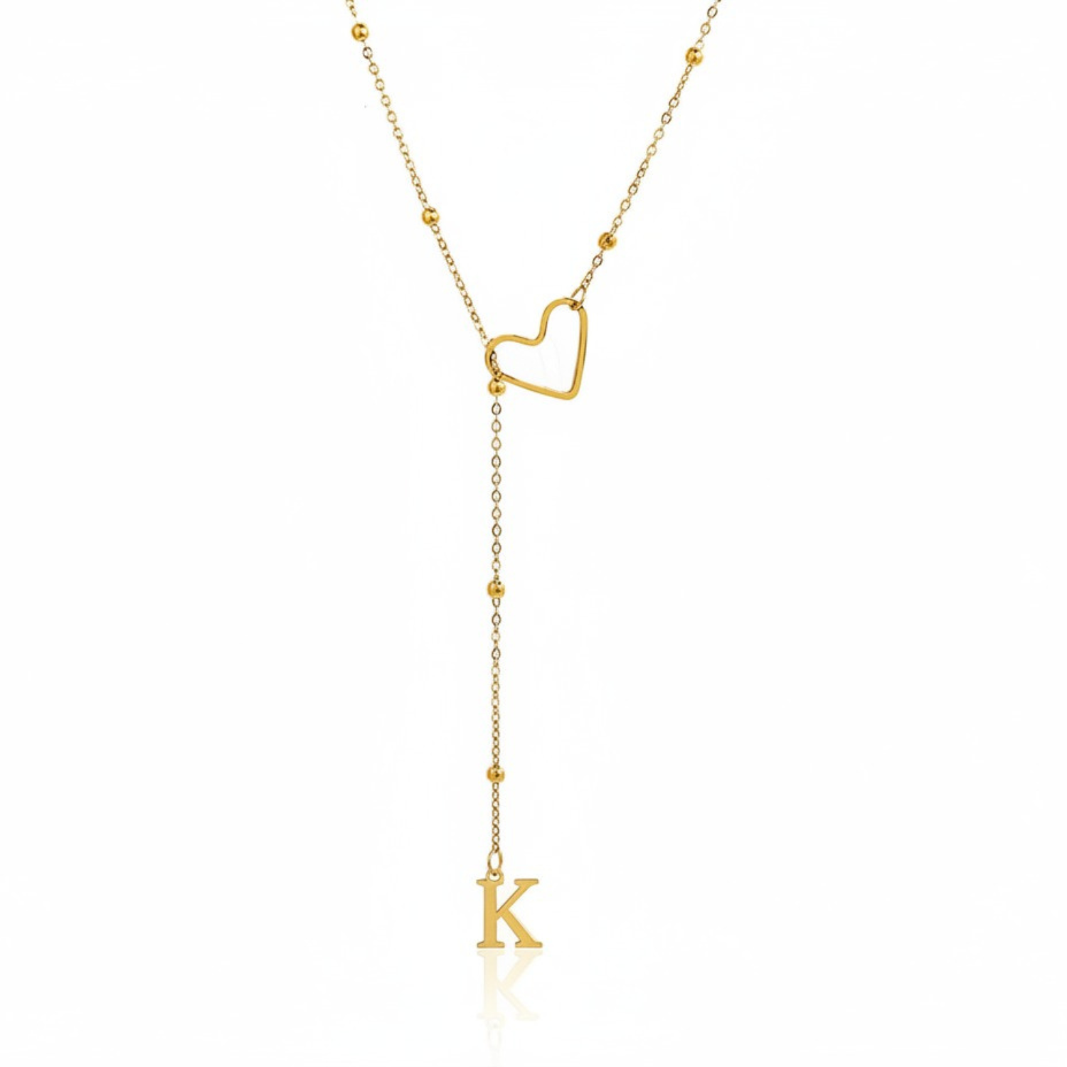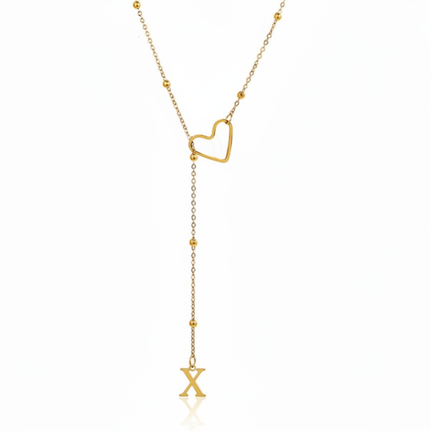 Deze verfijnde ketting vangt de essentie van persoonlijke verbinding: een delicaat hangende letter die zachtjes door een gouden hartje gaat, wat diepe en intieme verbondenheid symboliseert.