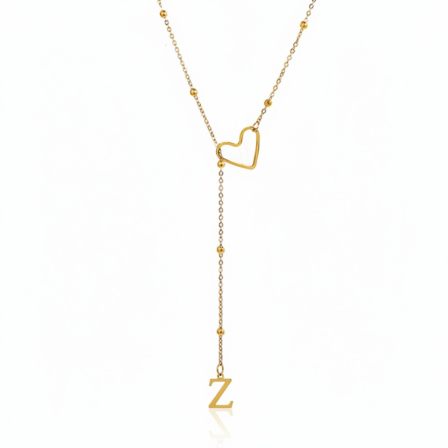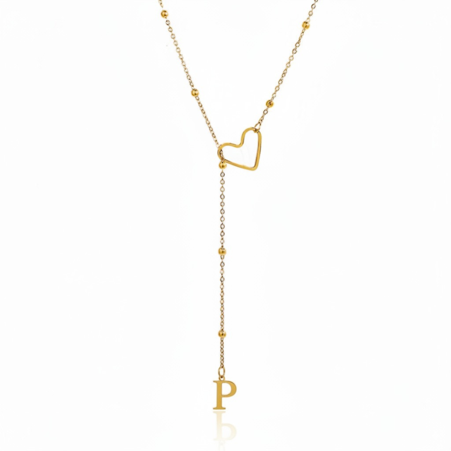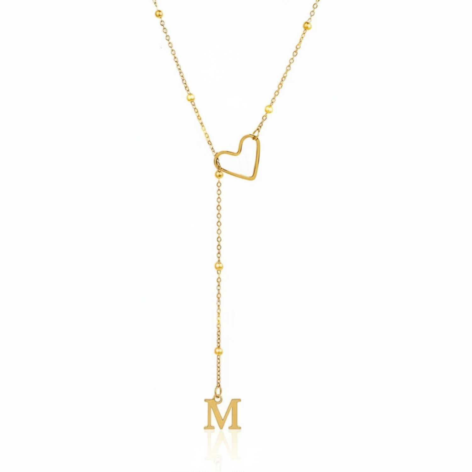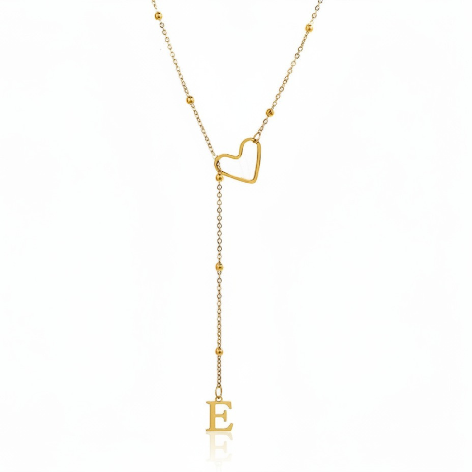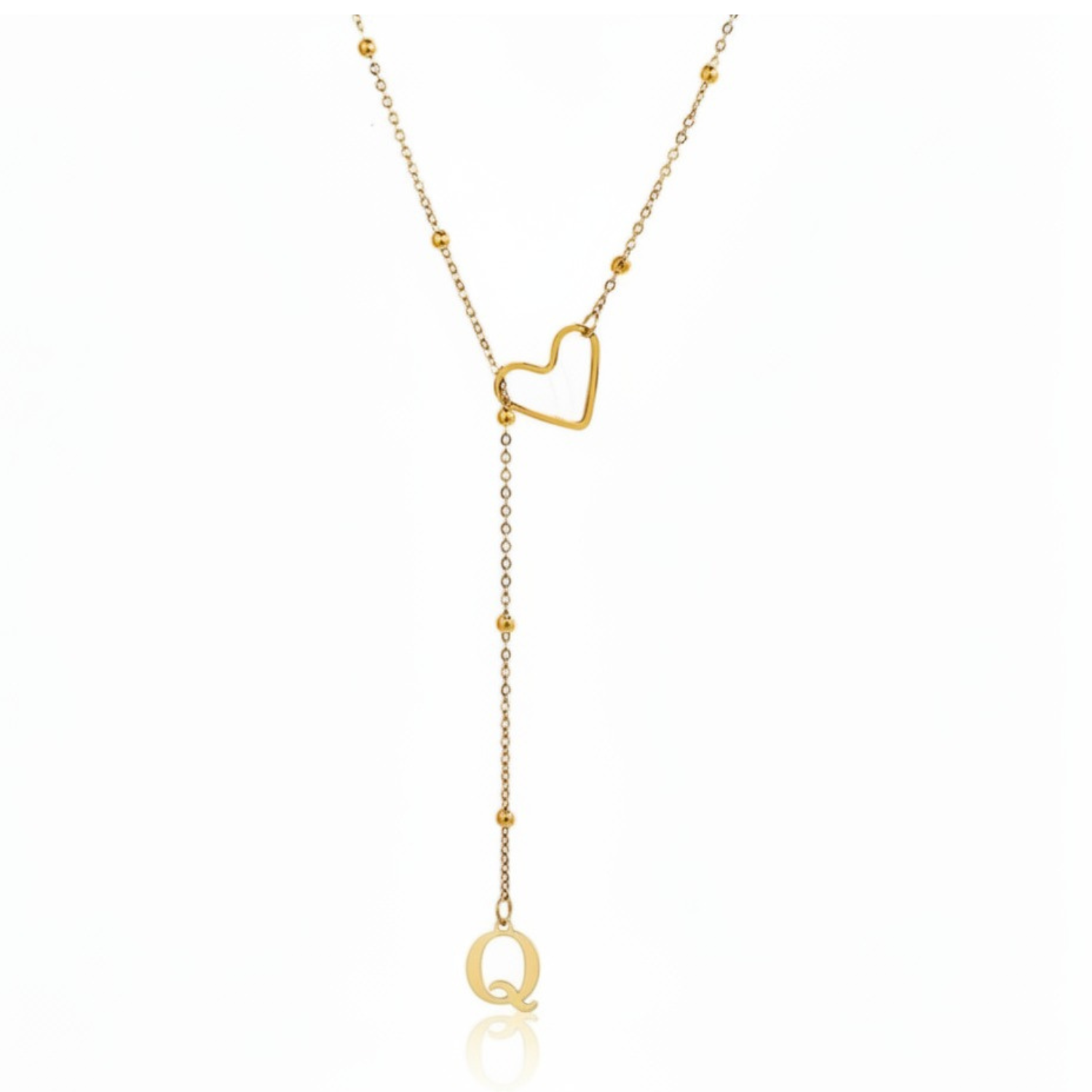 Deze verfijnde ketting vangt de essentie van persoonlijke verbinding: een delicaat hangende letter die zachtjes door een gouden hartje gaat, wat diepe en intieme verbondenheid symboliseert.
