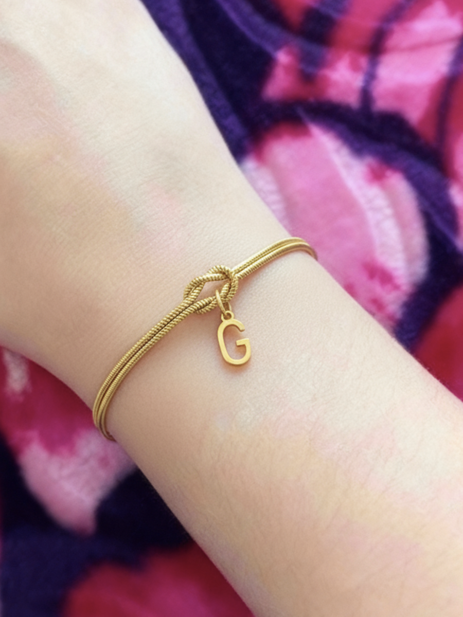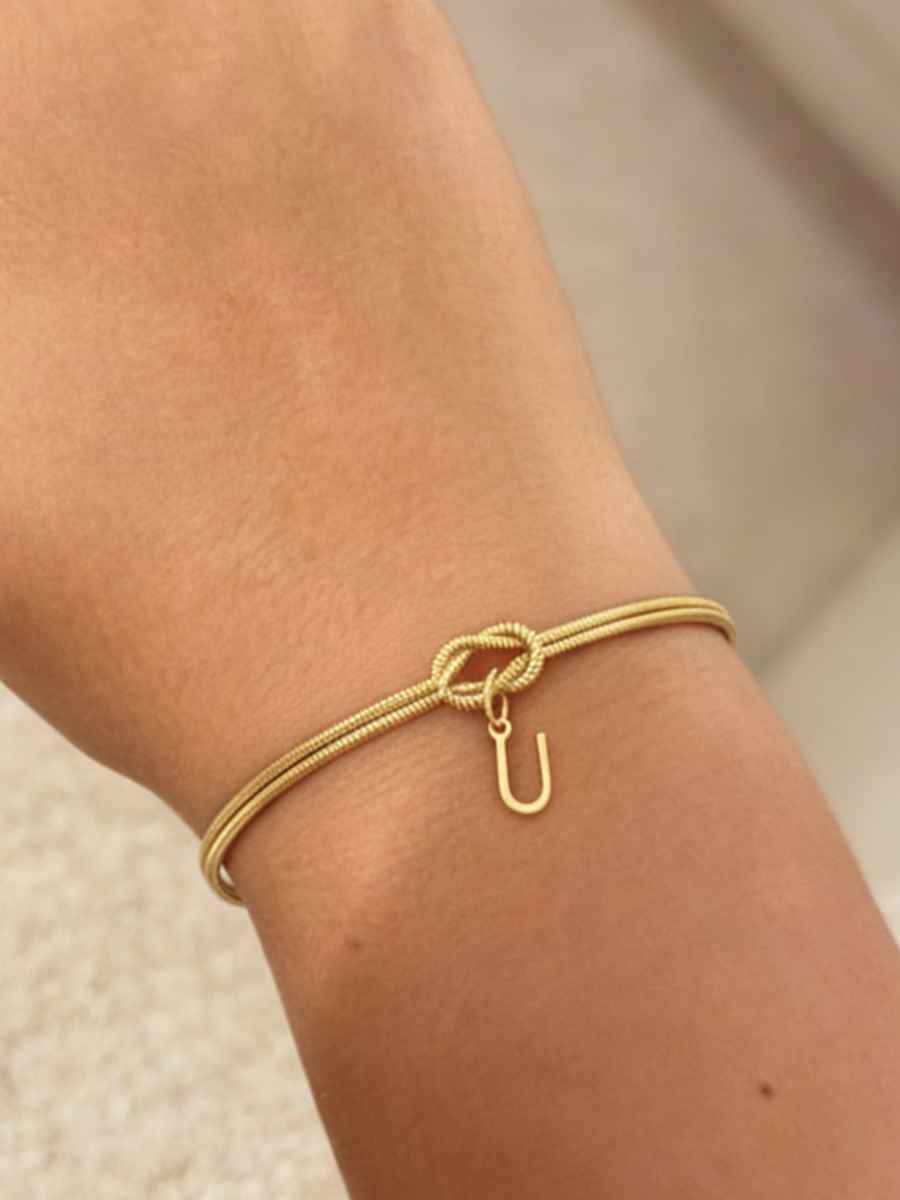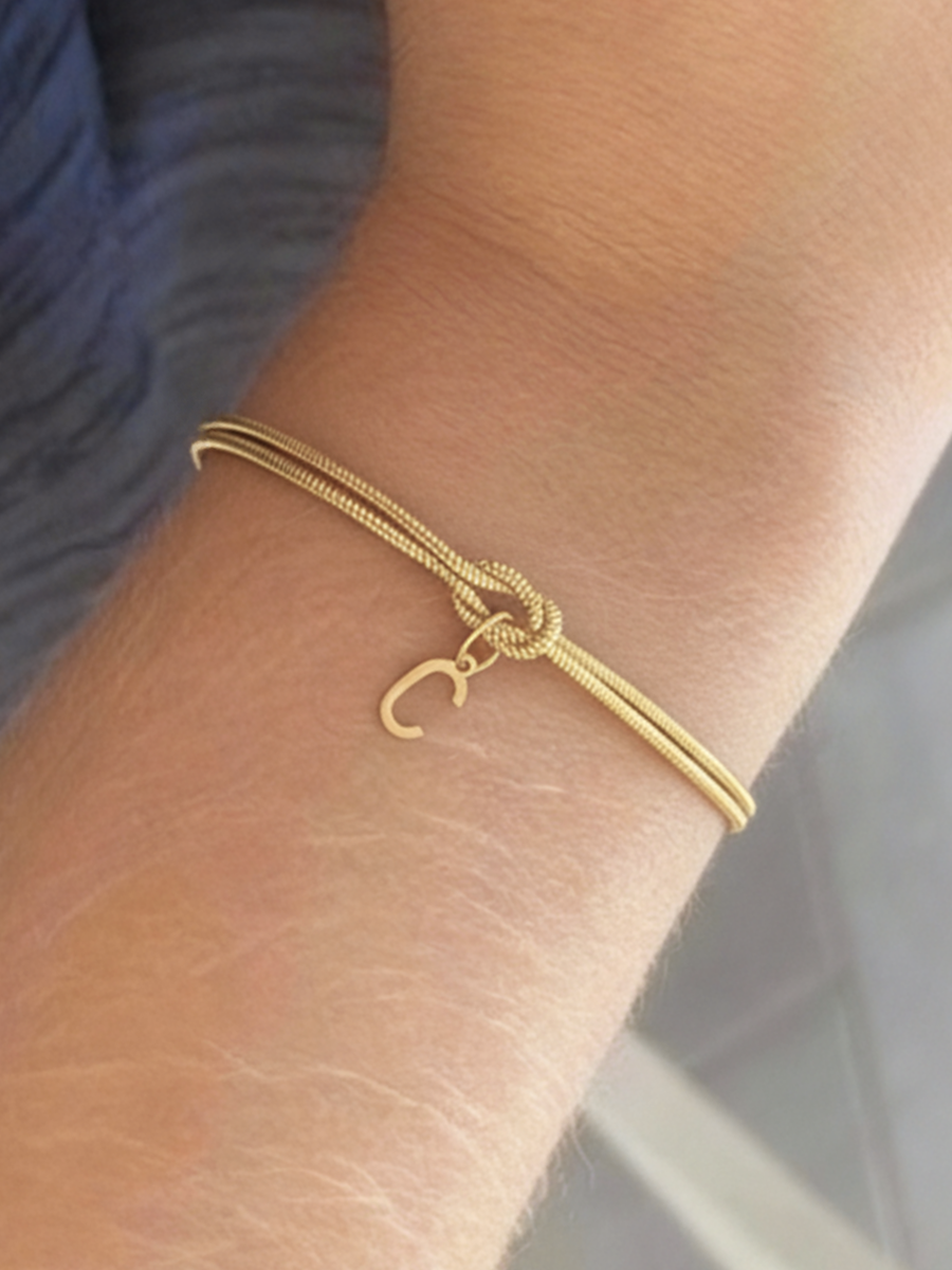 Een schakel die je elke dag kiest om te dragen. Deze slanke, eigentijdse armband combineert een elegante slangenketting met een symbolische knoop, waaraan een gepersonaliseerde initiaal hangt om een sterke verbondenheid te belichamen. Een subtiel detail dat veel zegt: of het nu je eigen letter is of die van een dierbare, het blijft kostbaar en dicht bij je.