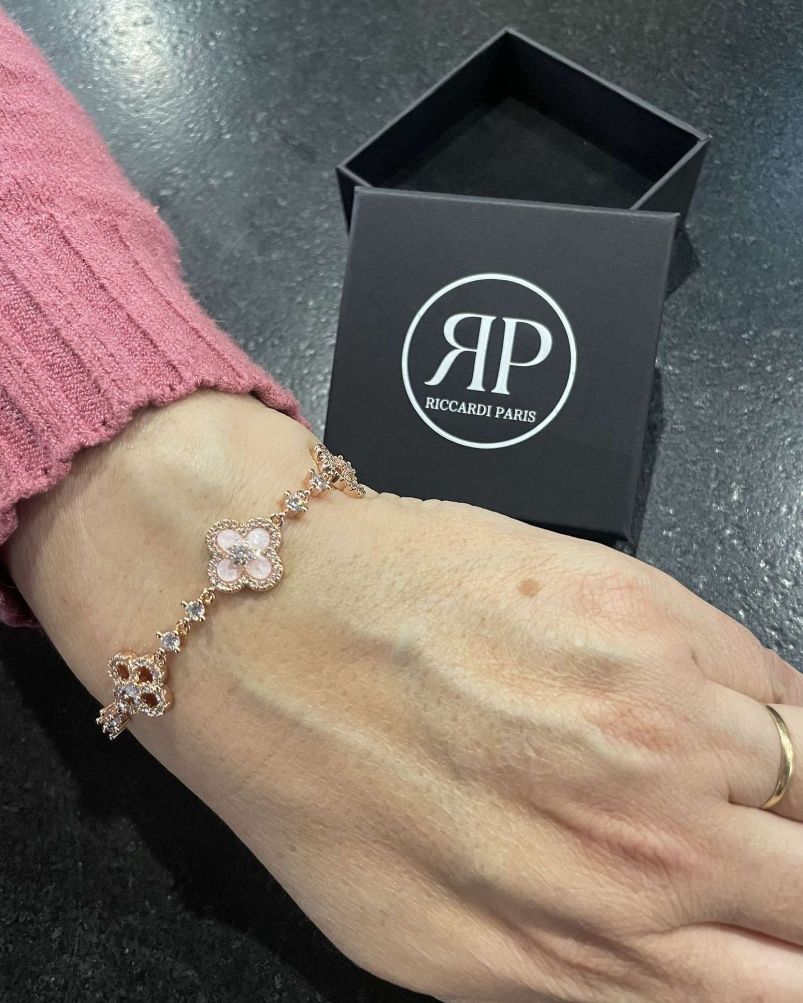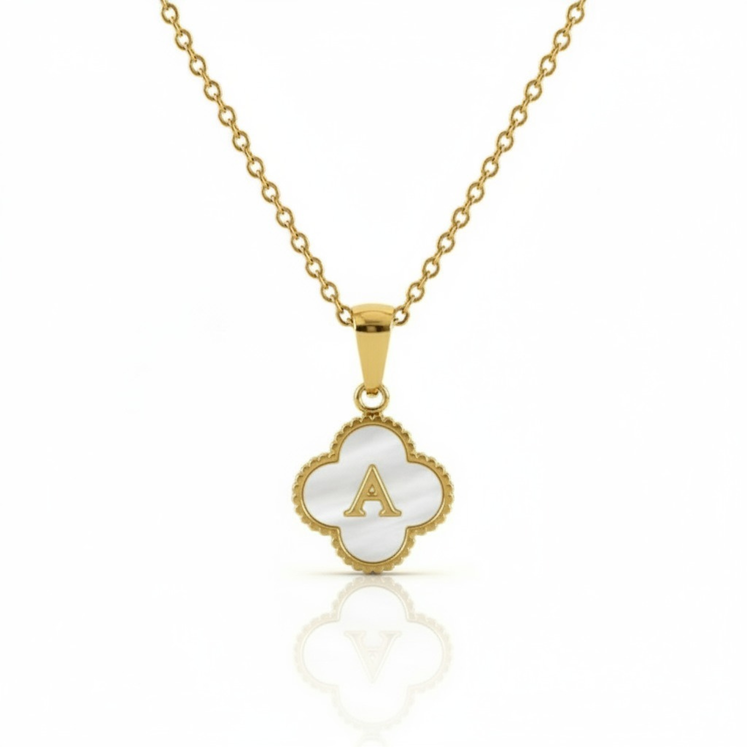 Deze verfijnde ketting combineert elegantie en personalisatie in een ontwerp dat delicaat is geïnspireerd door het gelukkige klavertjevier. In het midden steekt een initiaal naar keuze trots af tegen een stralende parelmoeren achtergrond, omlijst door een zorgvuldig vervaardigde gouden setting. De hanger in de vorm van een klavertjevier symboliseert geluk, waardoor dit stuk perfect is als een doordacht cadeau of een persoonlijk geluksamulet.