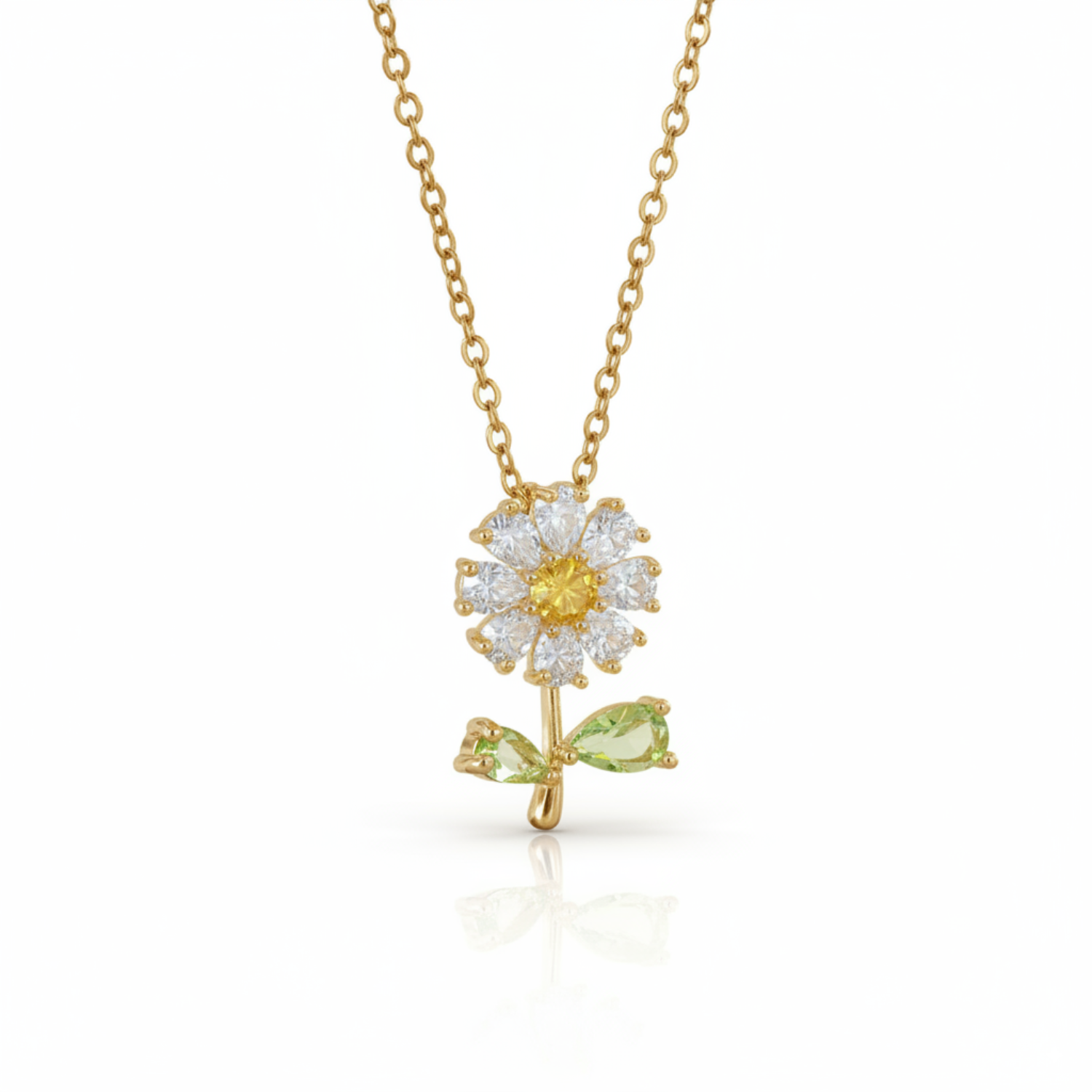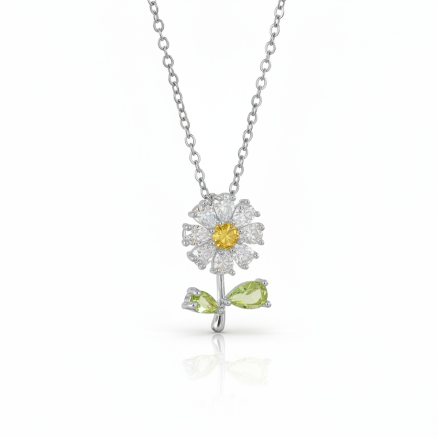 Delicaat, stralend en oneindig elegant, vangt de Pure Bloom ketting de tijdloze schoonheid van een bloem in volle bloei. De fijn vervaardigde hanger toont een madeliefje met parelachtige bloemblaadjes, vergezeld door kristalheldere bladeren met zachte groene reflecties.