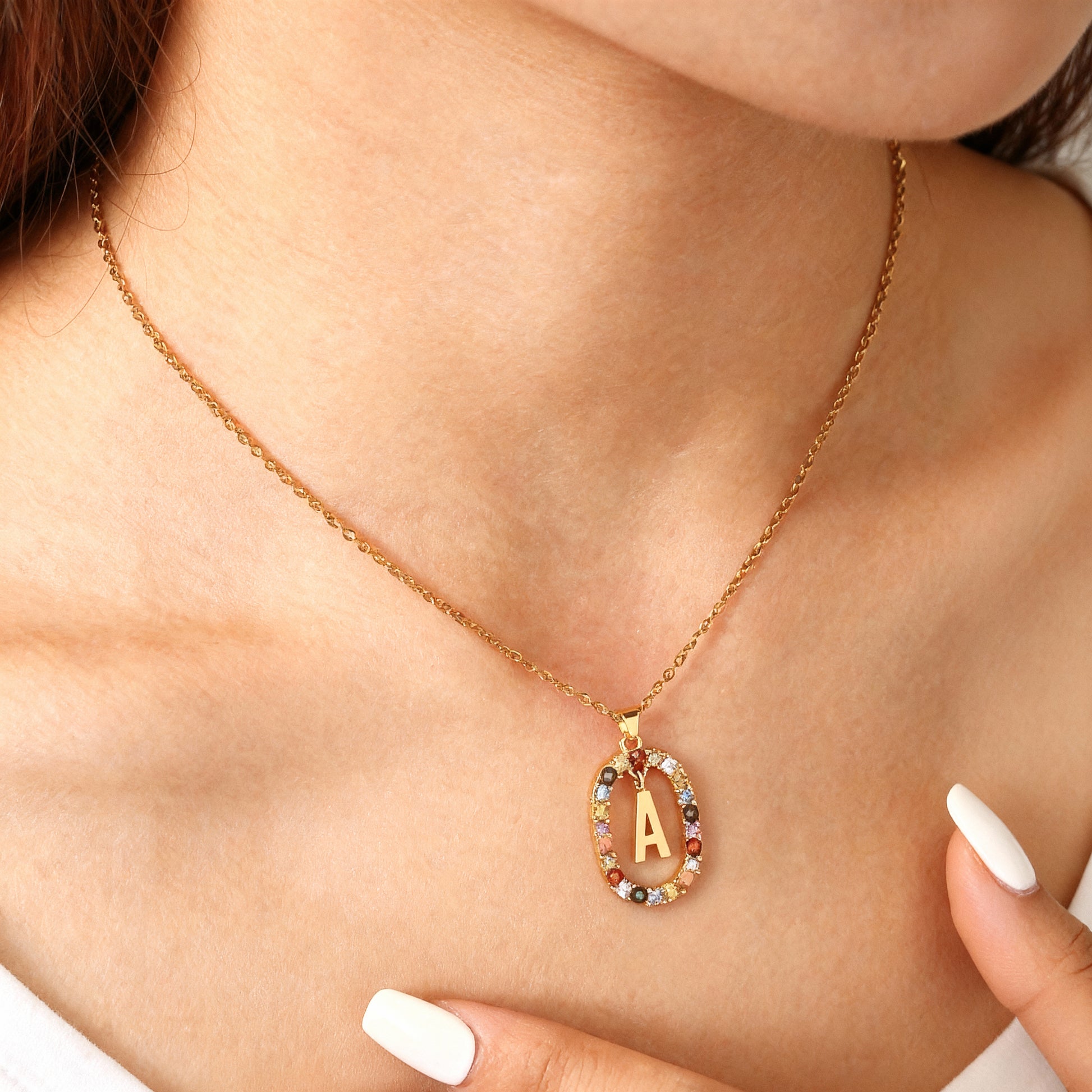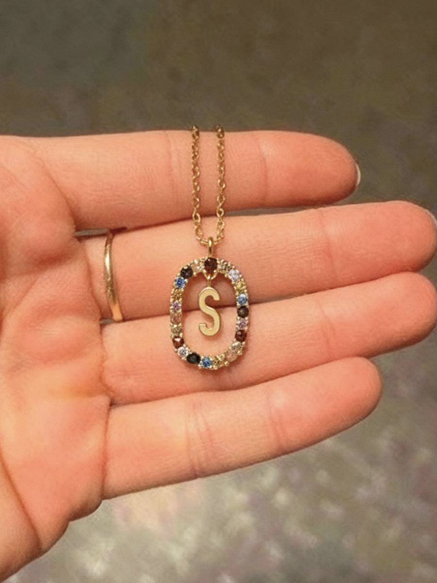 Voeg een vleugje kleur en elegantie toe aan je stijl met deze initialenhalsketting, delicaat versierd met meerkleurige strass-steentjes. De gouden hanger in de vorm van een letter, hangend in het midden van een fonkelende cirkel, vangt het licht vanuit elke hoek voor een gegarandeerd sprankelend effect. Elke strass-steen is zorgvuldig geselecteerd om een helderpaleis en vrolijk palet te bieden, waardoor elke initiaal nog waardevoller wordt.